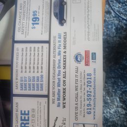 This is my 4th time to Family Auto - 2 times for oil changes, etc and two times for major work. A year ago for shocks/struts on my 2018 Nissan Altima and now with 72K miles, my first brake job. Pricing is great, and there was a $100 coupon available towards my bill. Tate MacKenzie is the General Manager, and Bryan helped explain the process. They were fast, courteous, and very helpful with providing me with the knowledge regarding this repair. I recently moved to El Cajon, and came back especially because of the service they provided !!!!!